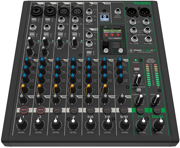 Распределение и настройка звучания источников звука возложена на микшерный пульт MACKIE ProFX10v3+. Это аналоговый микшер с цифровым блоком эффектов и расширенным функционалом их маршрутизации. Пульт имеет четыре микрофонных/инструментальных входа, две независимые стереопары для подключения стереоисточников и отдельный канал для линейного иди Bluetooth-подключения. Модель была выбрана по причине необходимости одновременного использования четырех микрофонов и независимой обработки и настройки каждого из них.