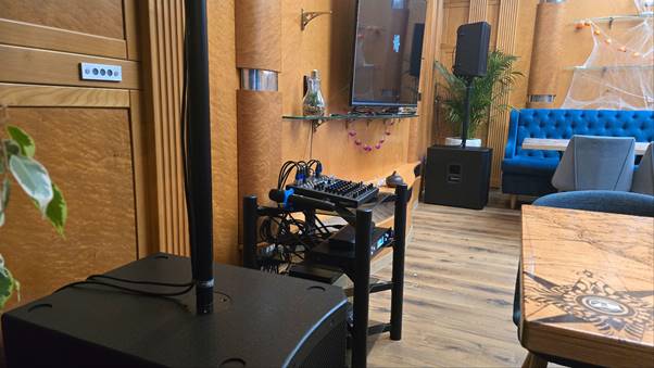 Само помещение оказалось очень выгодным в плане акустики (зал прямоугольной формы, обшитый деревом), поэтому для его озвучивания вполне достаточно двух сборок саб-сателлит. Использовали активные широкополосники УРАЛ x ARIS Имбирь 310-А и сабвуферы Имбирь Саб 315-А. Общая мощность акустического комплекта составляет 2 кВт RMS, SPL у каждого сателлита по 125 дБ, а у сабвуферов - по 131 дБ. Комплект способен серьезно раскачать зал и имеет солидный запас громкости, так что устроить настоящую дискотеку с пробивным басом в обозначенном помещении - легкая задача.