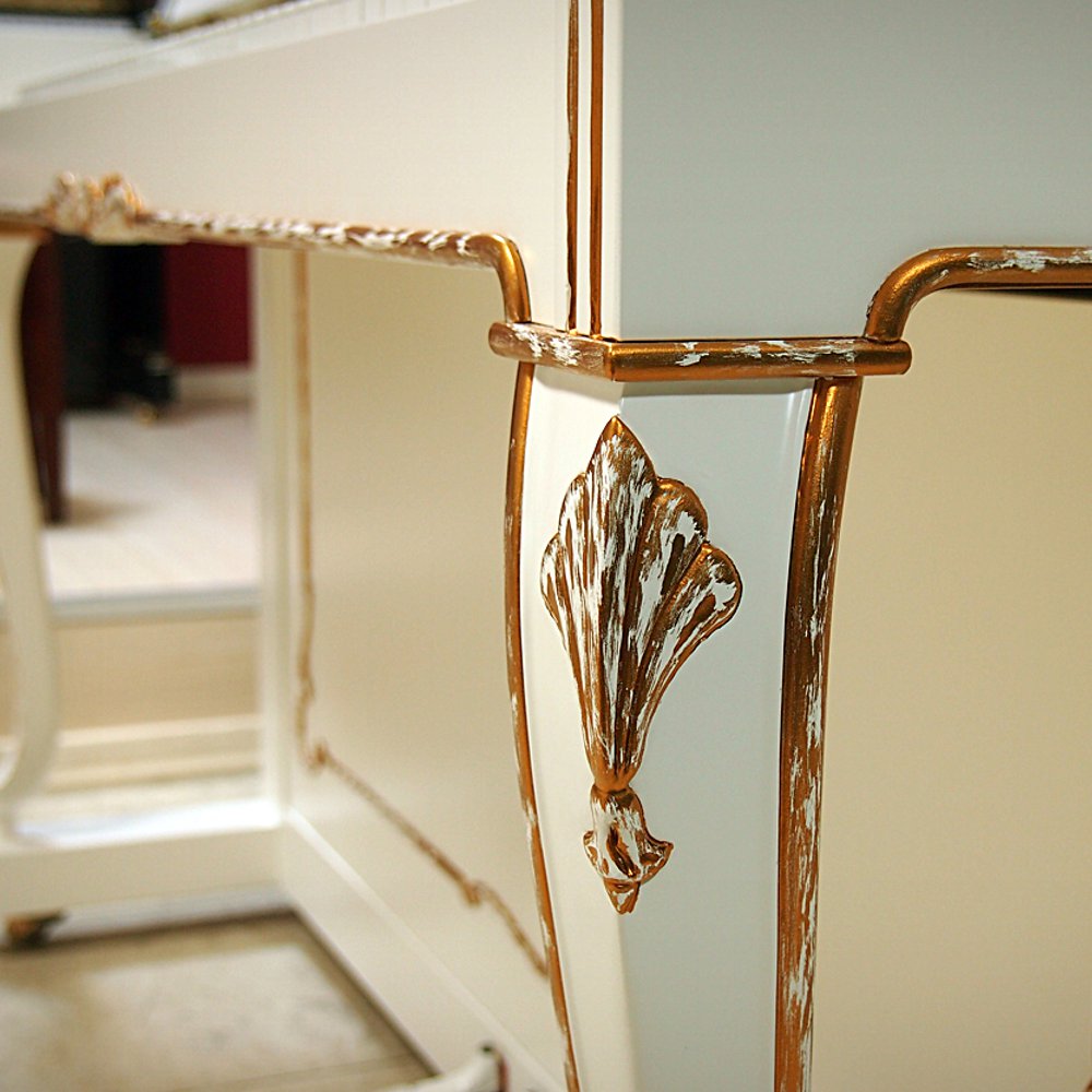 Petrof Style Rococo P 118 R1 выполнено в стиле Рококо – белая отделка, плавно изогнутые ноги в стиле Chippendale, резные элементы декора покрытые позолотой.